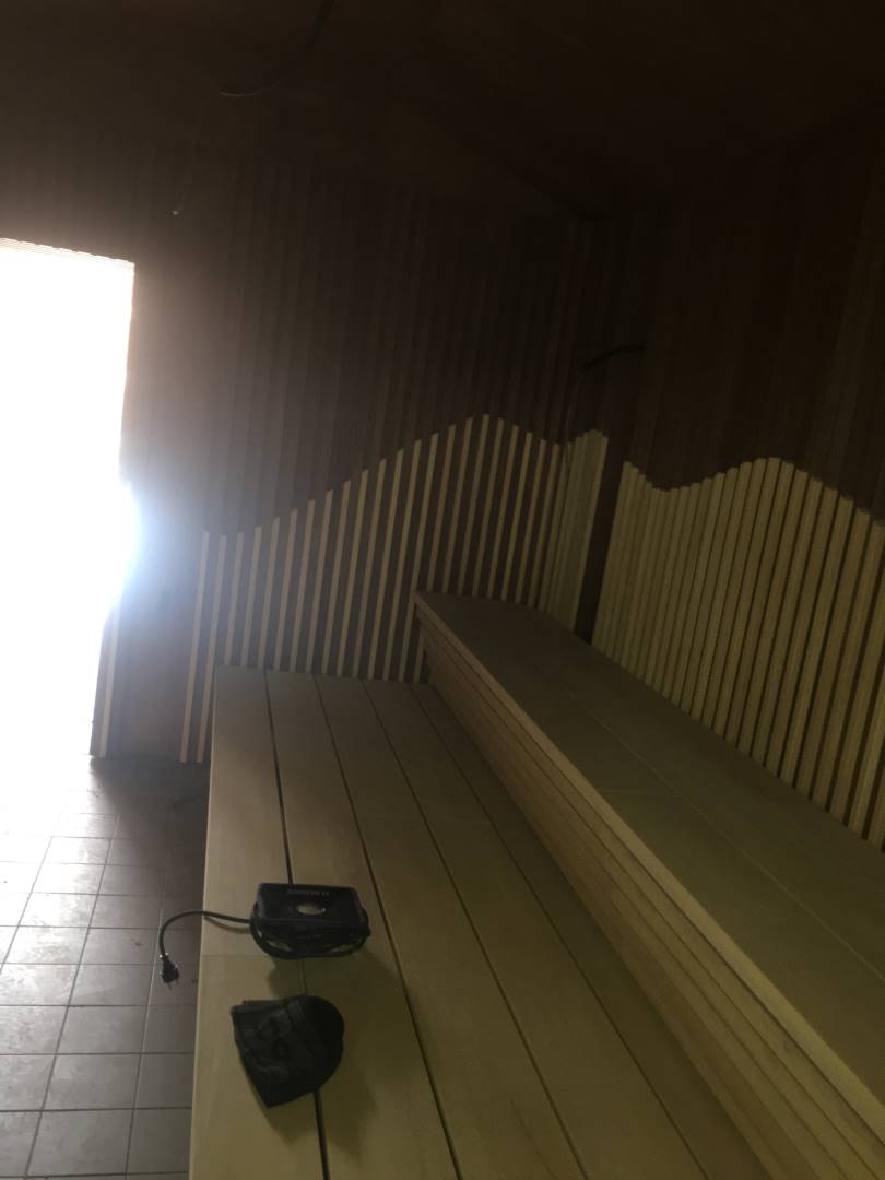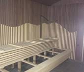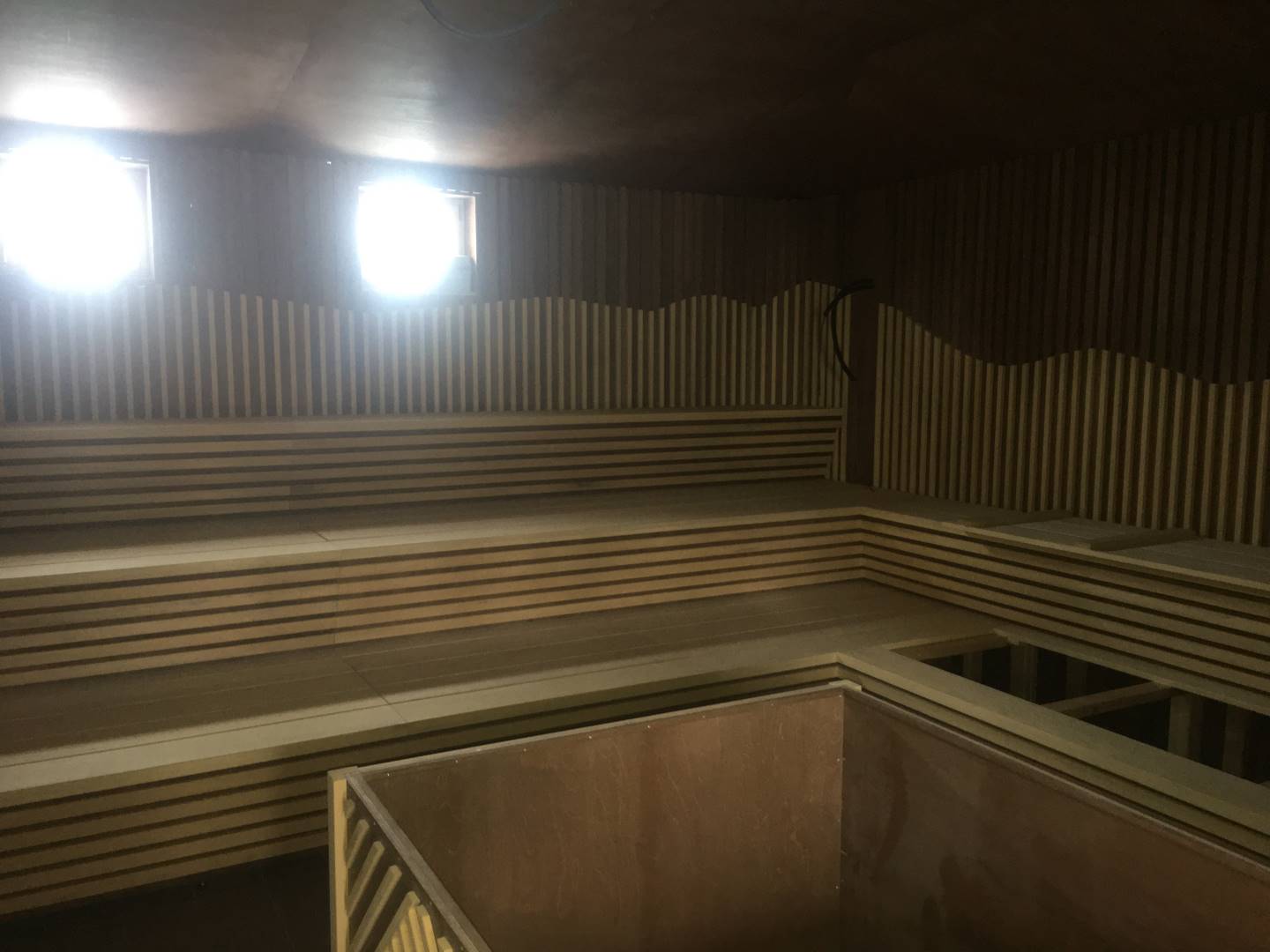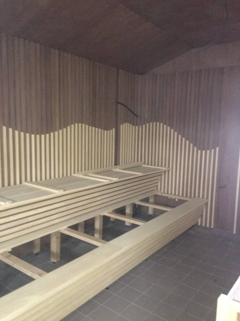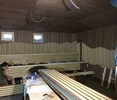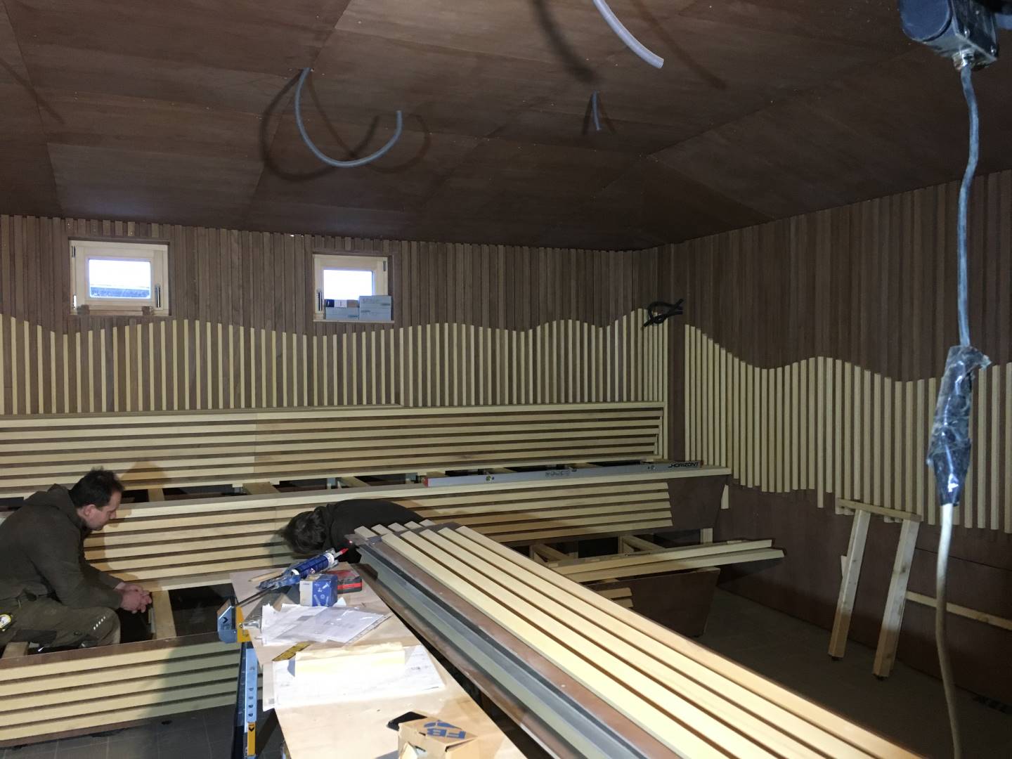Interiér této sauny jsme opět nejprve zaizolovali minerální izolací od firmy Rockwool a použili stříbrnou hliníkovou fasádní folii. Po dokončení konstrukčních příprav jsme se pustili do finálních obkladů. Celý interiér sauny jsme pokryli dýhovanou překližkou, na kterou jsme použili nátěr od firmy Tikkurila. Tato překližka byla již součástí pohledové části. Největší výzvou bylo ohýbaní překližky v rozích, jelikož celá sauna byla v rohách do oblouku.