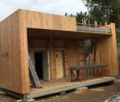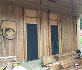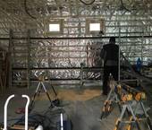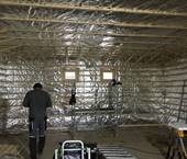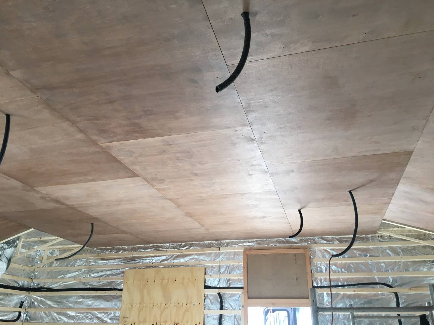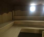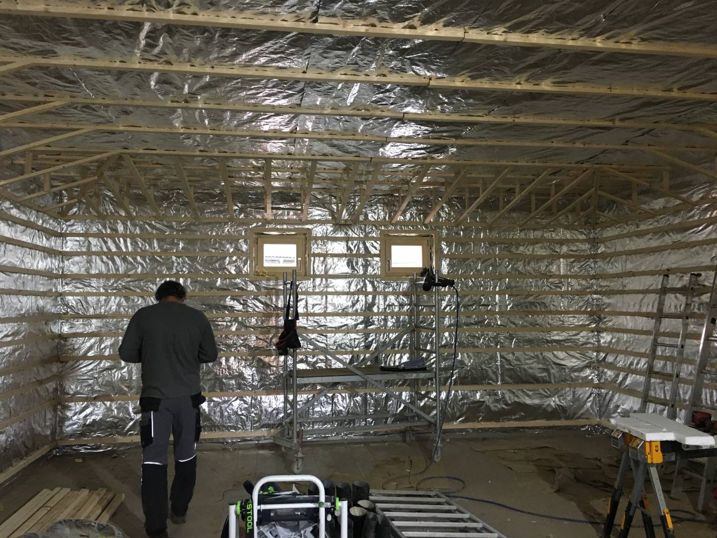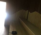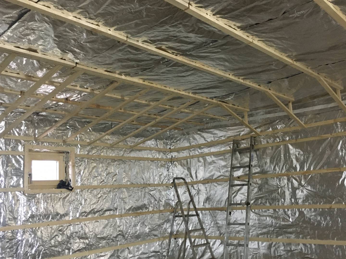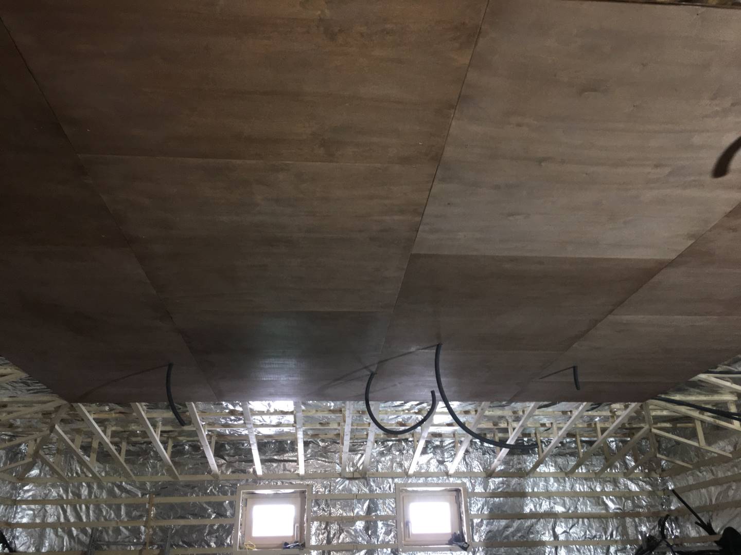 Interiér této sauny jsme opět nejprve zaizolovali minerální izolací od firmy Rockwool a použili stříbrnou hliníkovou fasádní folii. Po dokončení konstrukčních příprav jsme se pustili do finálních obkladů. Celý interiér sauny jsme pokryli dýhovanou překližkou, na kterou jsme použili nátěr od firmy Tikkurila. Tato překližka byla již součástí pohledové části. Největší výzvou bylo ohýbaní překližky v rozích, jelikož celá sauna byla v rohách do oblouku.