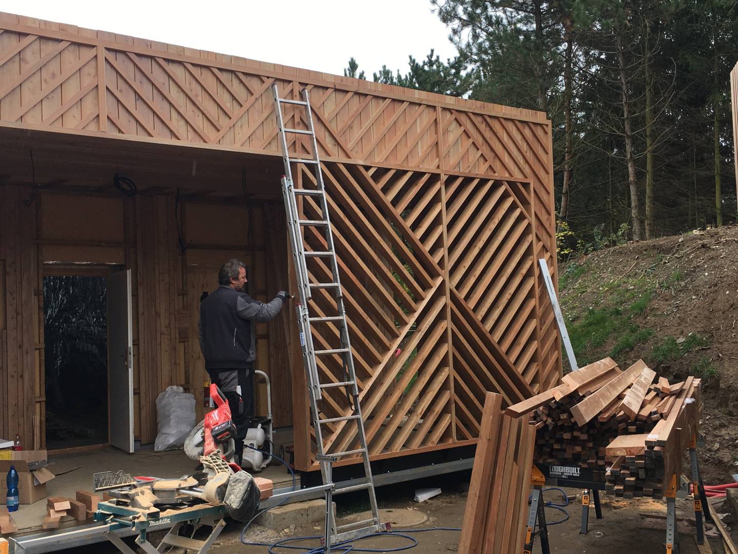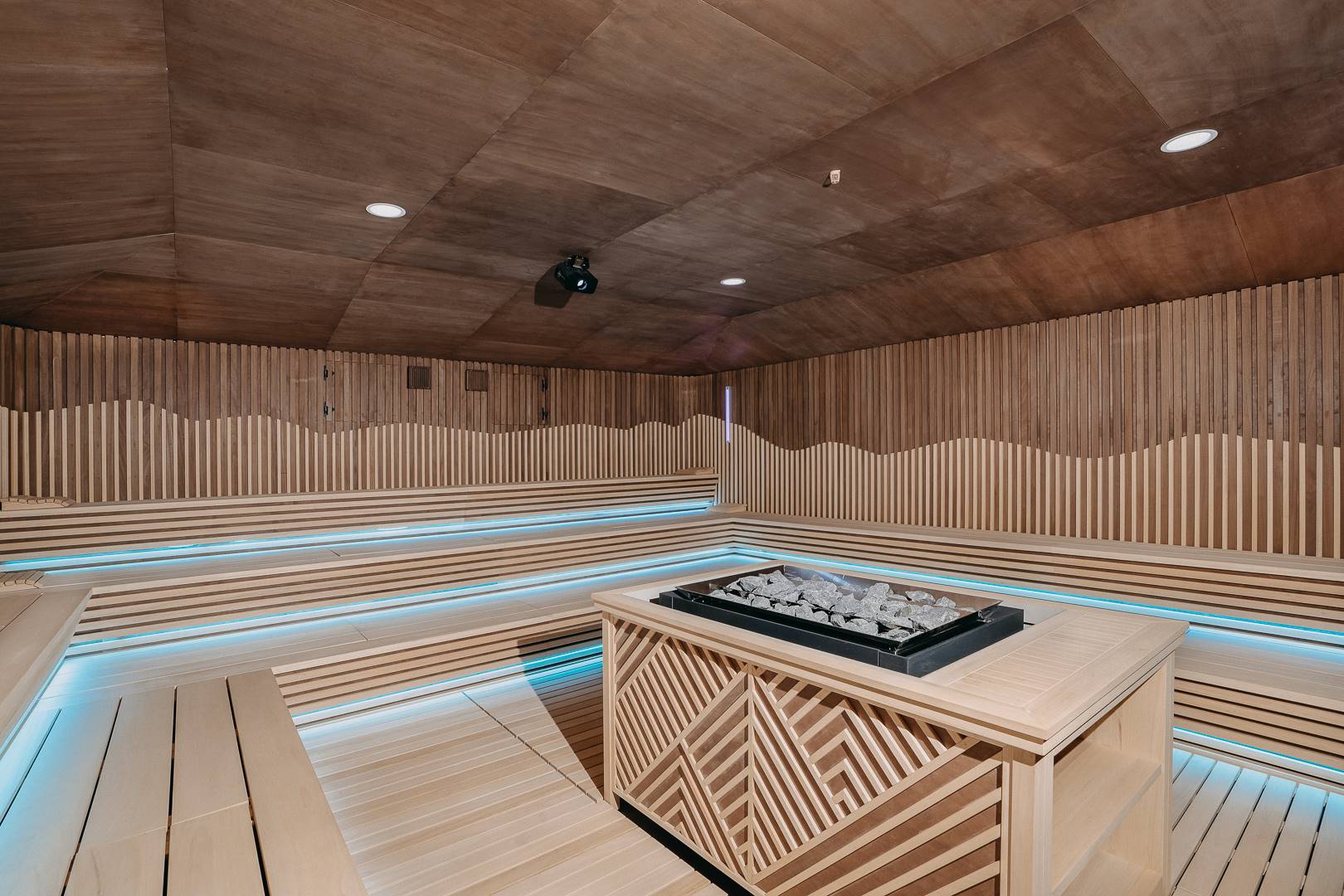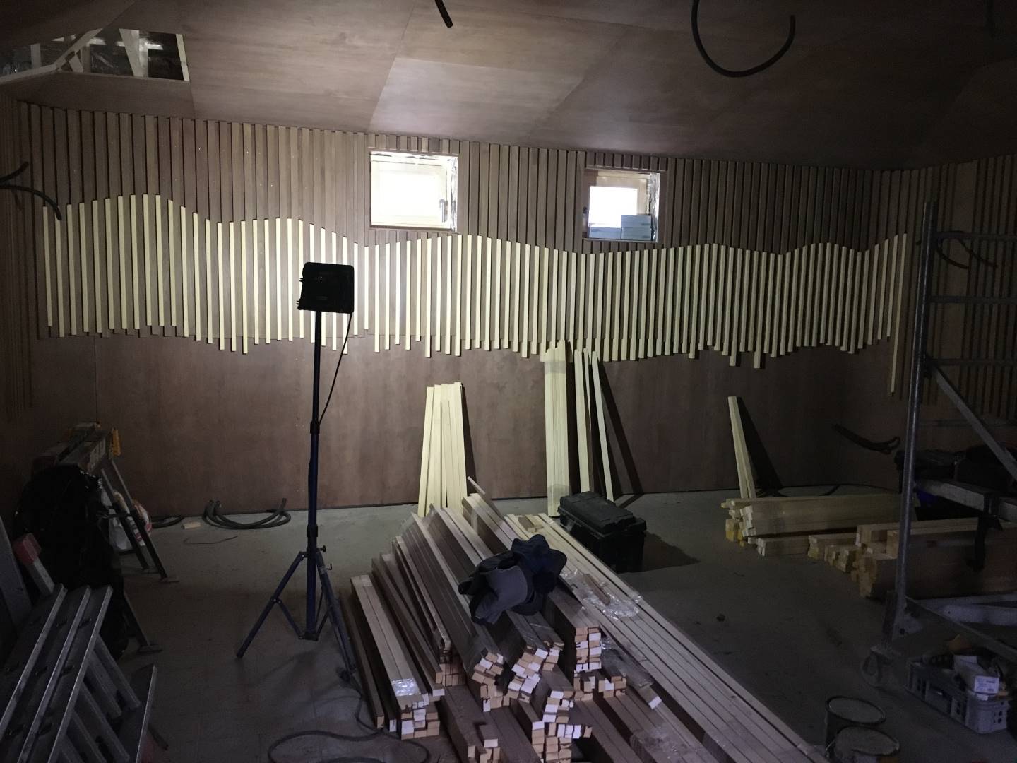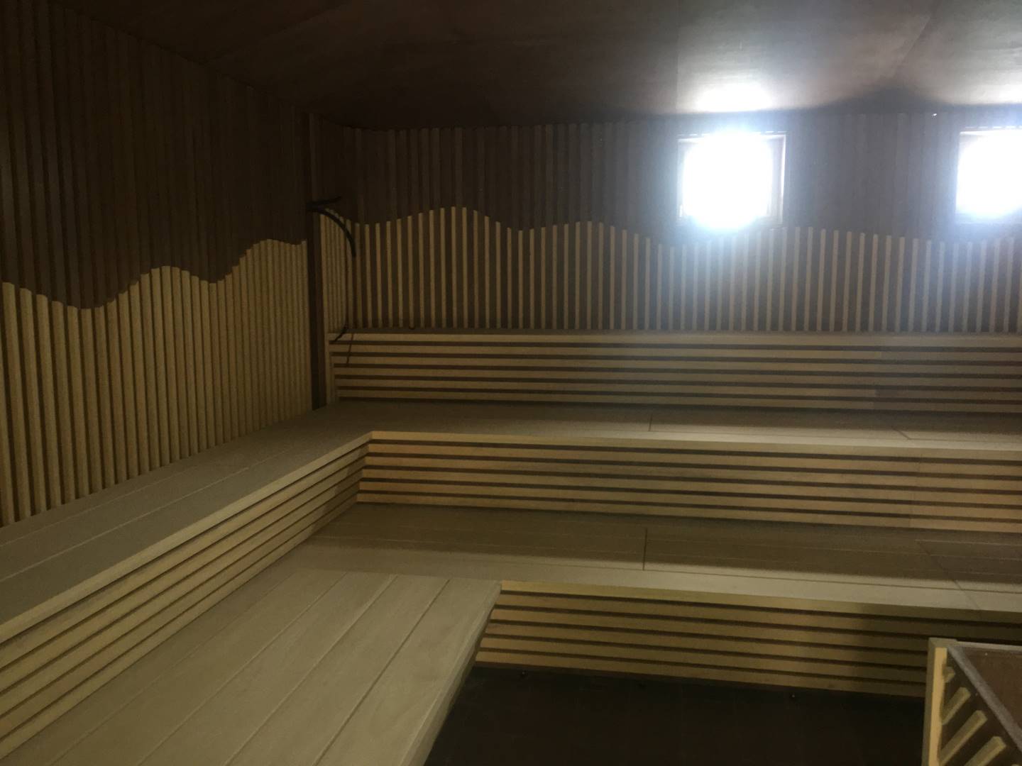 Finální částí v rámci montáže byl laťový obklad z Abaschi. Pravidelné střídání latí světlého a tmavého odstínu mělo od začátku hlubší význam. V rámci infinit saunových světů, totiž probíhají speciální ceremoniály, kde sauna mistři pracují s ručníky. Těmito ručníky díky máchaní na Vás posílají horký vzduch. A my měli tohle máchnutí ručníku přenést v rámci vln na stěnu. Tato montáž probíhala v úzké kooperaci s architekty, jelikož jsme takzvaně „ladili“ jednotlivé vlnky, aby působili co nejpříjemněji.